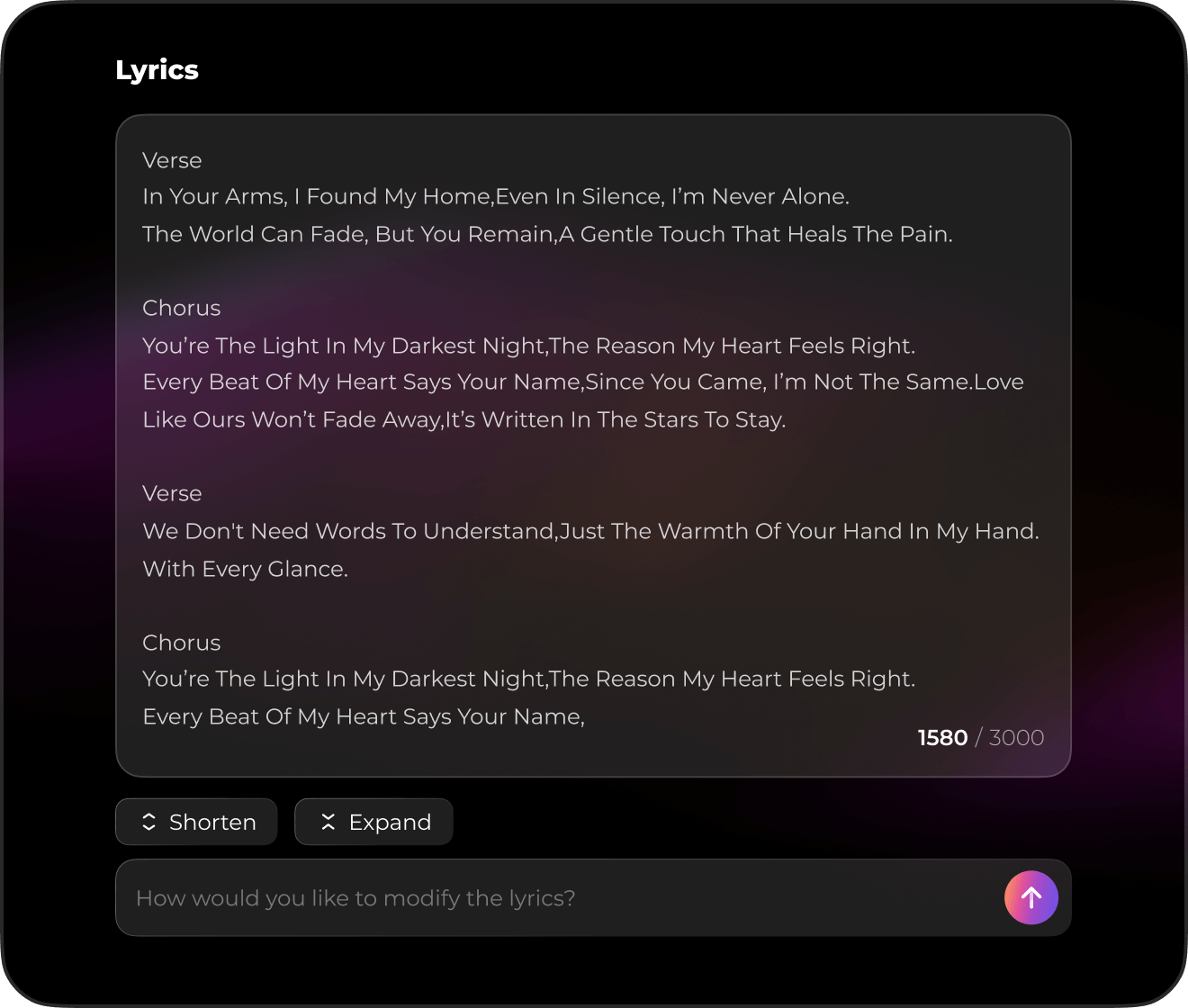 A: The creation process of other products on the market is more like a black box, making it difficult to fine-tune intermediate steps, especially the lyrics, which are often disappointing. We provide a very convenient interface for modifying lyrics. You can either edit the lyrics manually or continue refining them through conversation with the AI until you are satisfied.
