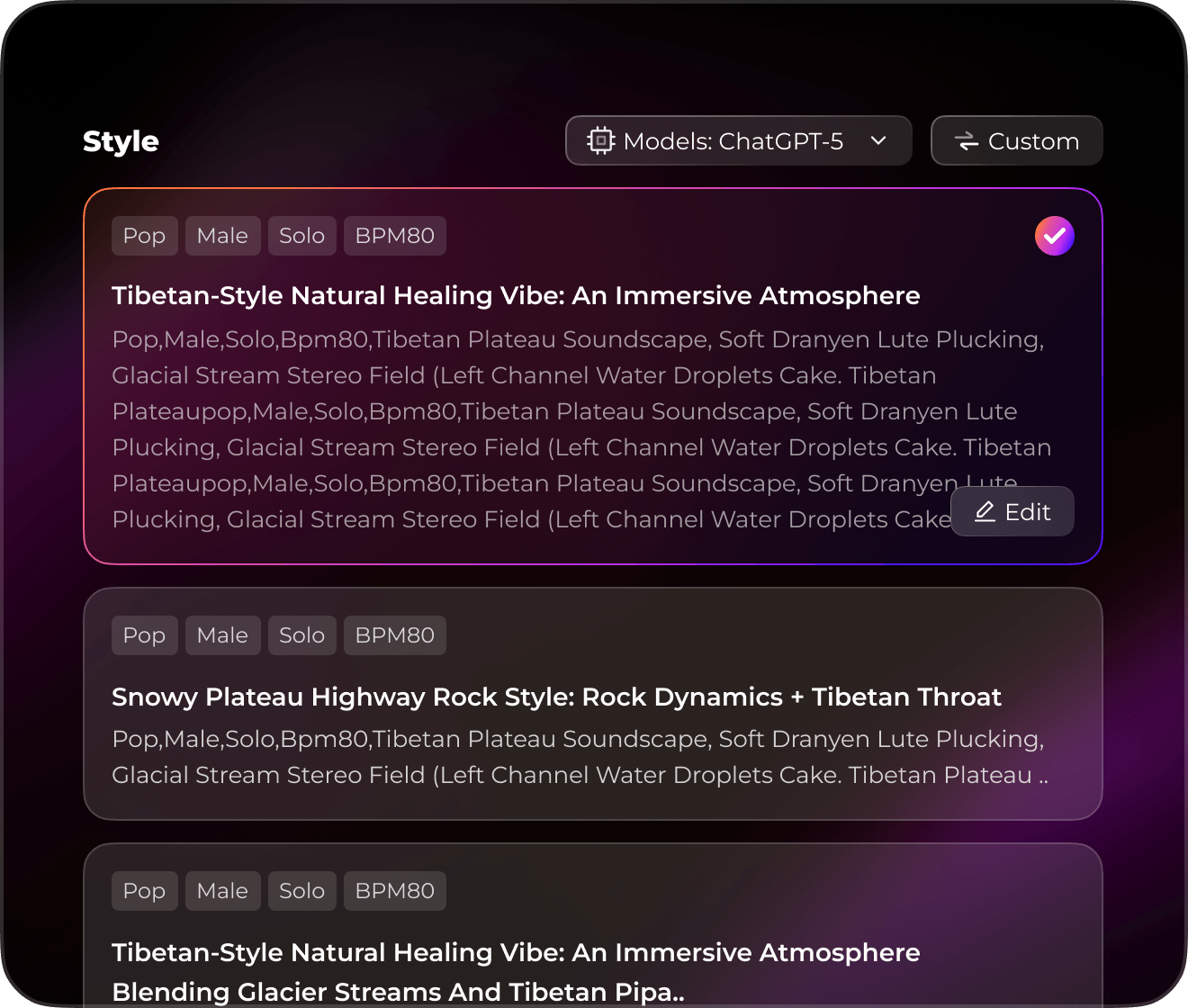 After the lyrics are finalized, Meloty.ai's magic continues: it automatically generates multiple style prompts. These prompts are tailored specifically for your lyrics.