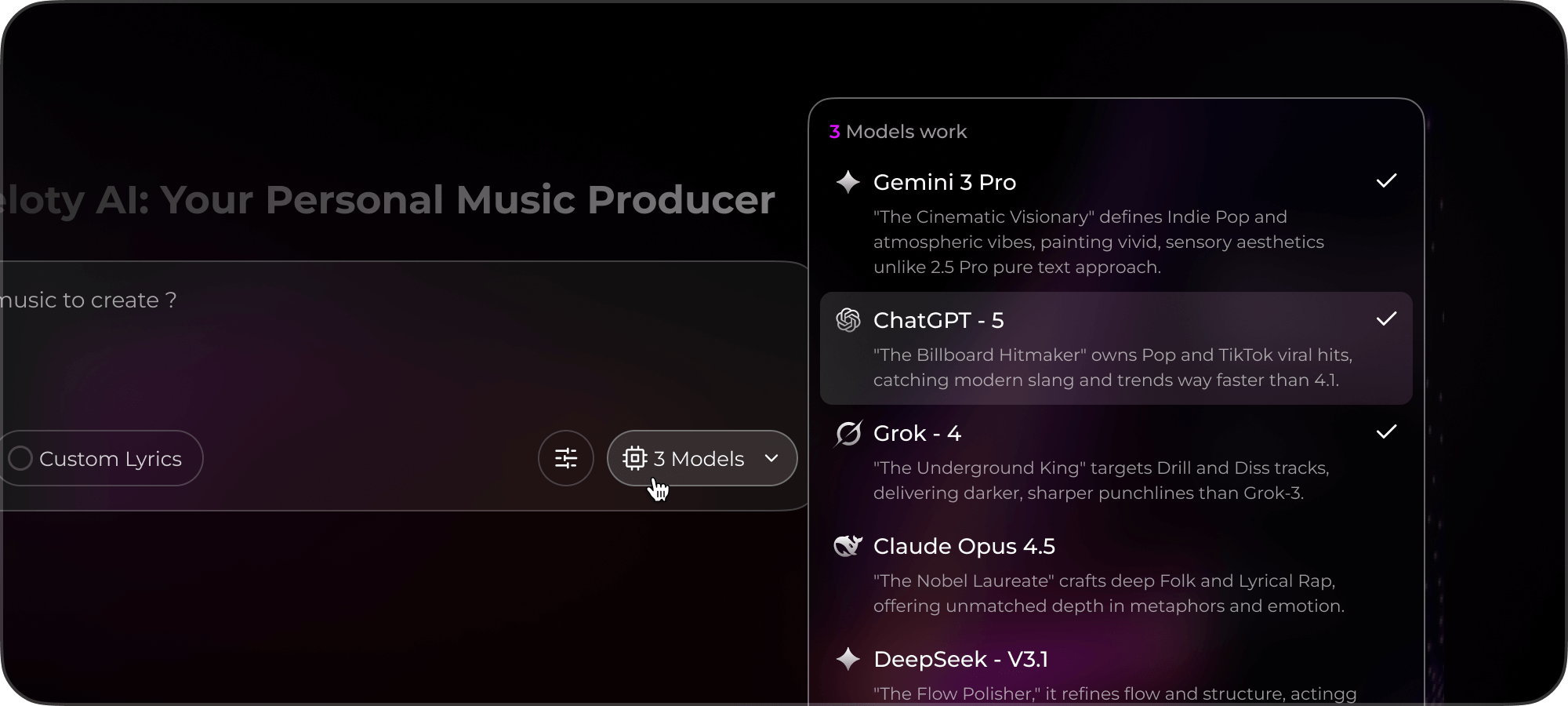 In Meloty.ai, lyric generation is no longer an isolated "black box" operation. You can call upon multiple large models simultaneously