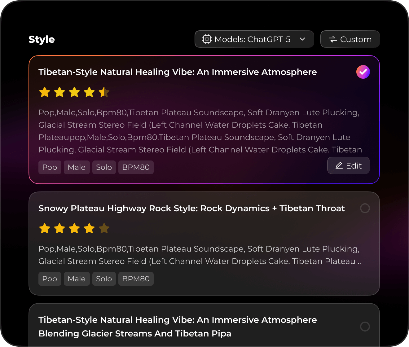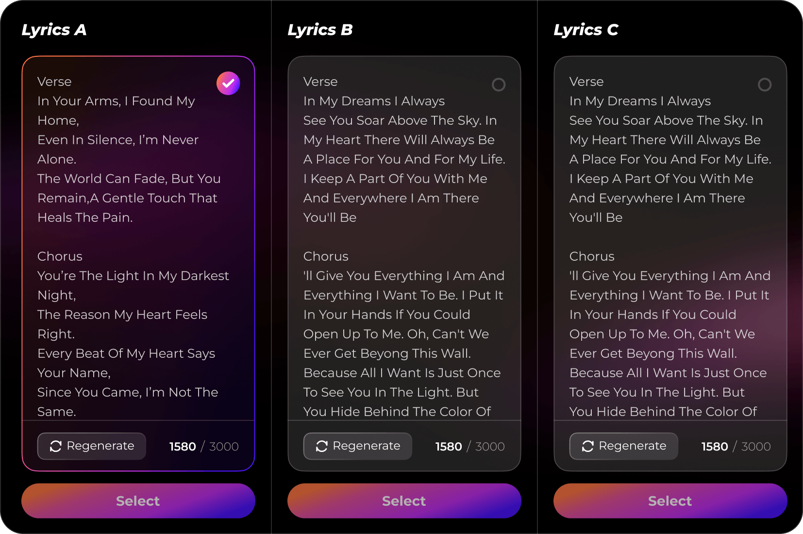Choose your favorite lyrics and style prompts from the Agent's multiple options.