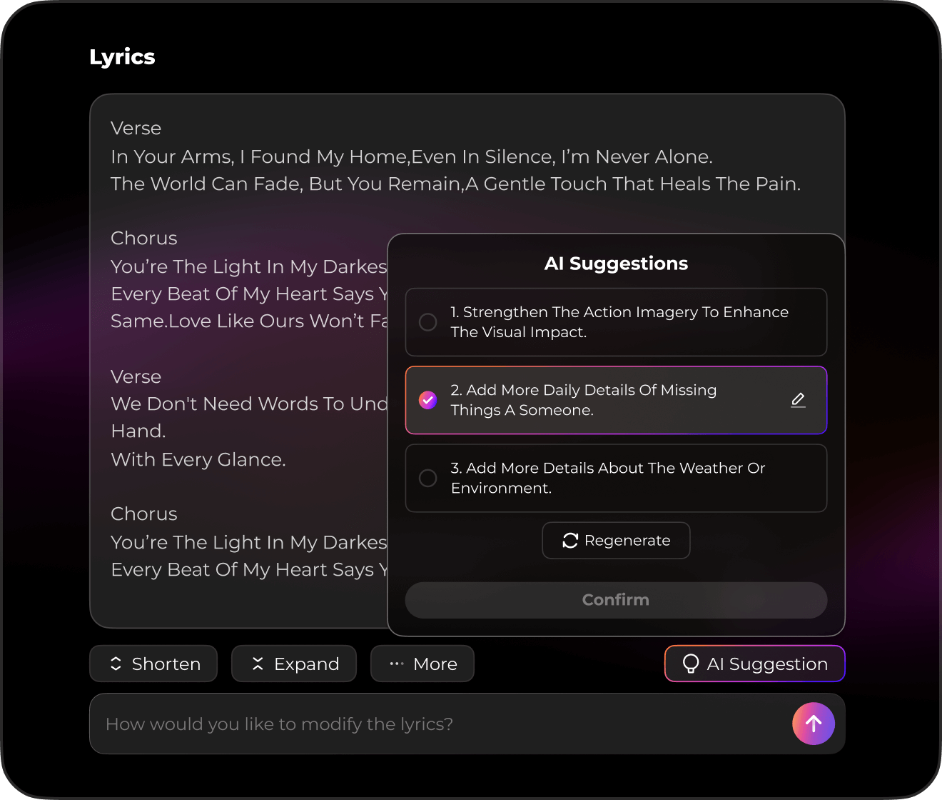 A: Our product is specifically designed to break down the technical barriers in music creation. Not knowing music theory is not a problem. As long as you have emotions, stories, or ideas, leave the rest to us. The AI Agent will analyze your needs and background, automatically generating multiple versions of lyrics and style prompts. You simply need to choose or make slight adjustments to generate music that better fits your requirements.
