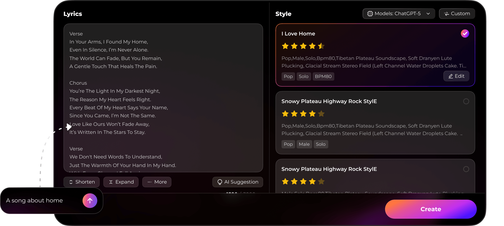 Choose your favorite lyrics and style prompts from the Agent's multiple options.